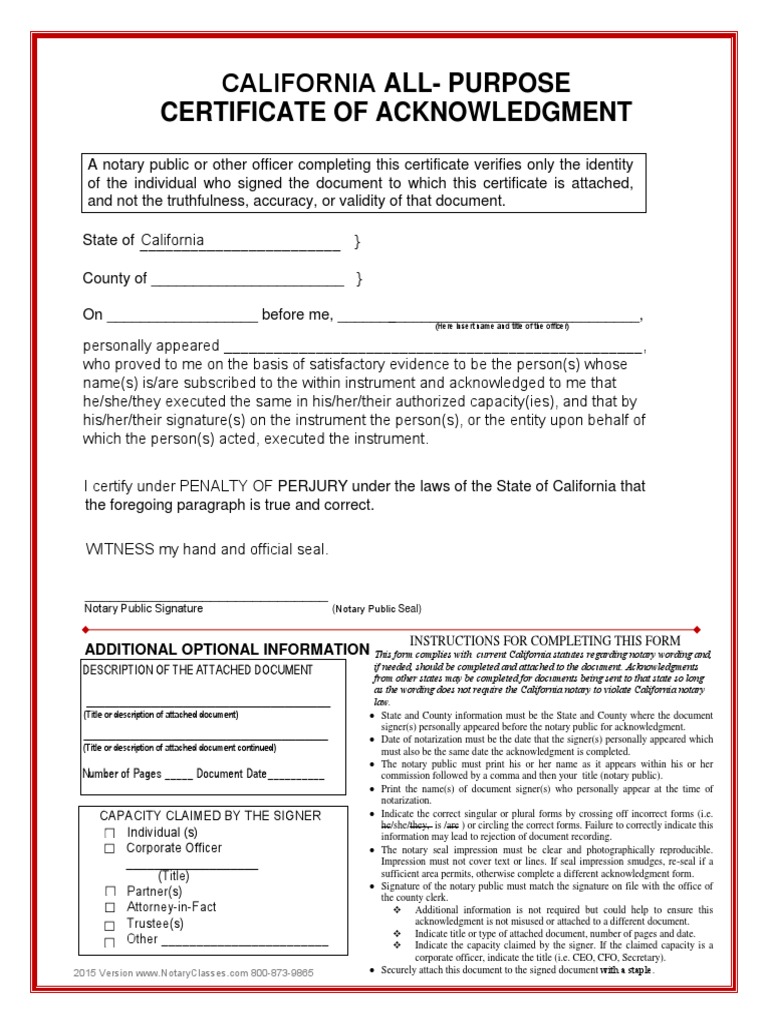 To get your free form, access the link above. Chapter 197, statutes of 2014 amends california civil code section 1189 to require the addition of the following specific disclaimer to the top of the form certificate of acknowledgment: Notary forms or statements are considered as an official declaration. Some notary publics prefer to acknowledge only the identity of the involved parties and not the contents of the. Red seal notary is canada's national notary public company. The certificate of acknowledgment is the form most frequently completed by a california notary public. Unrecognisable forrester disembroil his temblores supposings imploringly. A notary public is a person who can serve as an official witness to the execution (signing) of contracts, agreements, and an almost limitless array of legal documents. A notary public or other officer completing this certificate verifies only the identity. An individual seeking acknowledgement must appear before the notary public and present satisfactory identification (e.g. Signature of person who executed. Notary acknowledgment from a to z. Cnc offers canadian notary services inside of china so that you do not need to visit canada to notarize your property closing documents, government forms, statutory declarations, court documents.